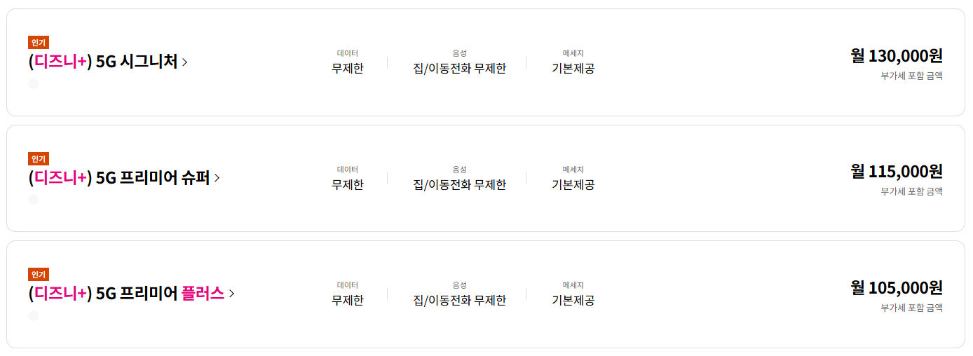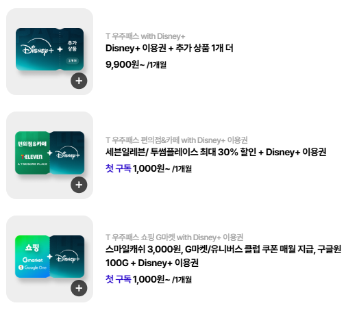 또한, SK KT, LG 와 제휴된 요금제도 있어요. 디즈니 플러스 요금제로 다양한 분야를 이용할 수가 있어요.