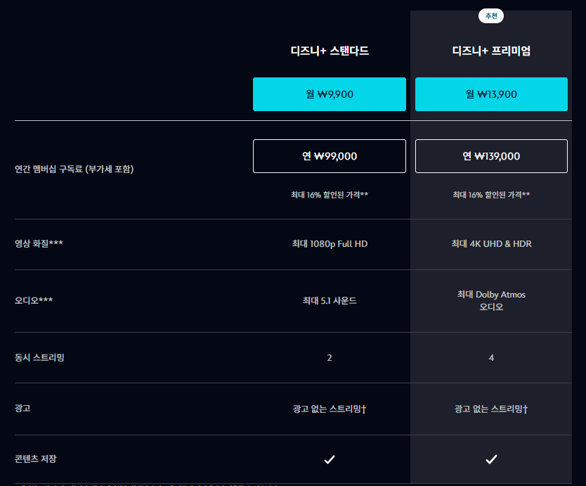 🟤 디즈니+ 프리미엄: 월 13,900원으로, 4K Ultra HD와 HDR 화질, Dolby Atmos 오디오를 제공해요. 이 요금제는 최대 네 대의 기기에서 동시에 스트리밍 할 수 있어요.