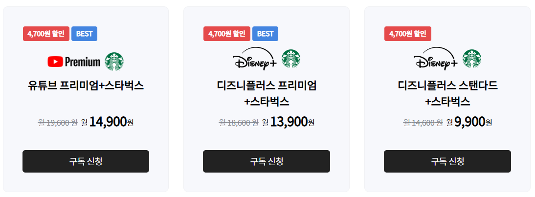 예를 들어, KT에서는 "디즈니플러스 스탠다드 + 스타벅스"는 월 9,900원에 스타벅스 혜택도 함께 제공하기 때문에 스타벅스를 좋아하는 분들에게는 더할 나위 없는 선택이겠죠? SK, LG에도 다양한 혜택들도 있으니 참고해 주세요.