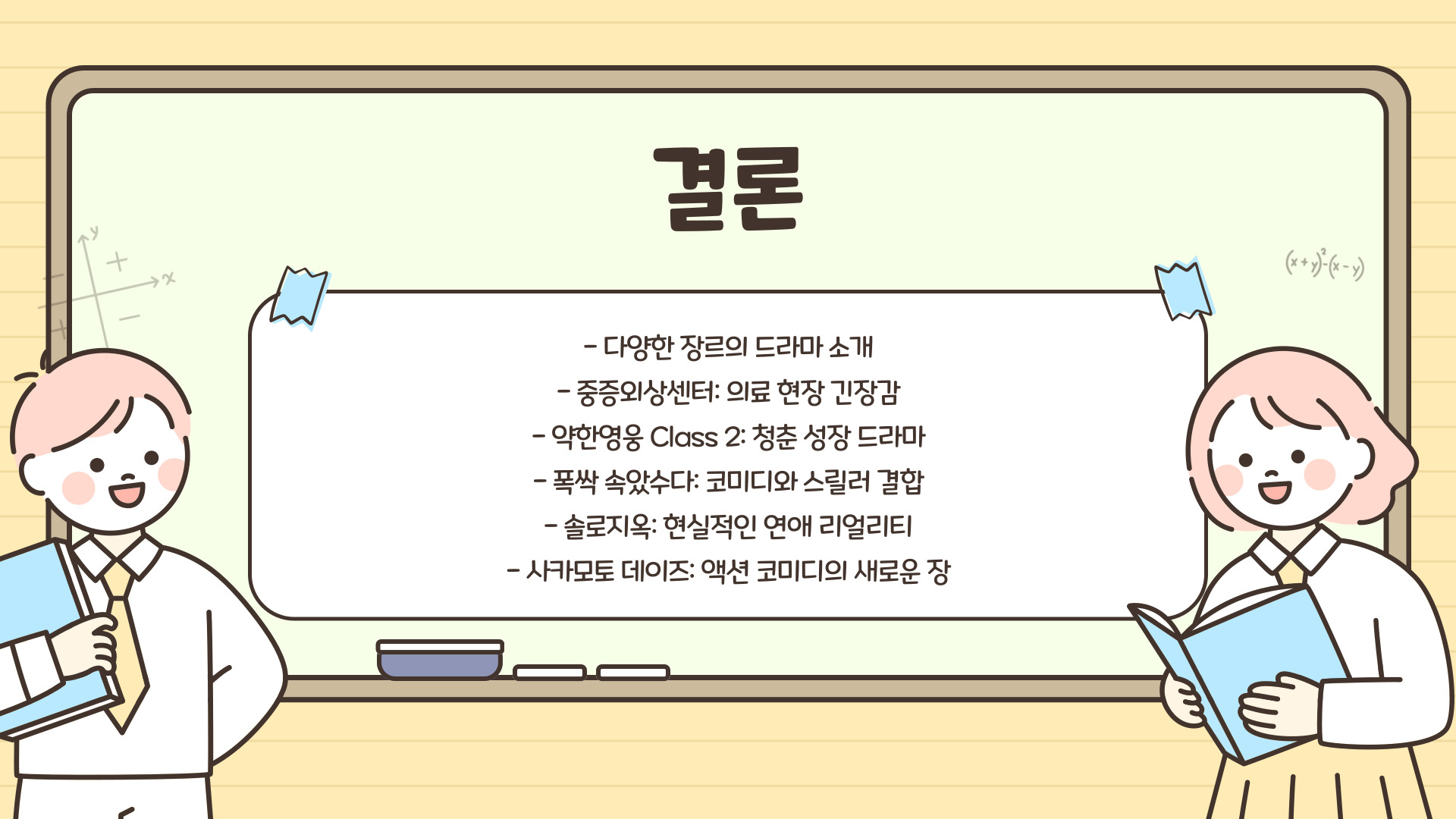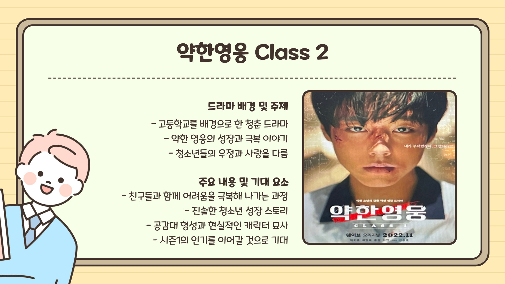 두 번째는 약한영웅 Class 2 에요. 이 드라마는 고등학교를 배경으로 한 청춘 드라마로, 약한 영웅이 어떻게 친구들과 함께 어려움을 극복해 나가는지를 그린 이야기예요. 특히, 청소년들의 우정과 사랑, 그리고 성장 과정을 진솔하게 담아내어 많은 이들의 공감을 얻을 것으로 기대돼요.