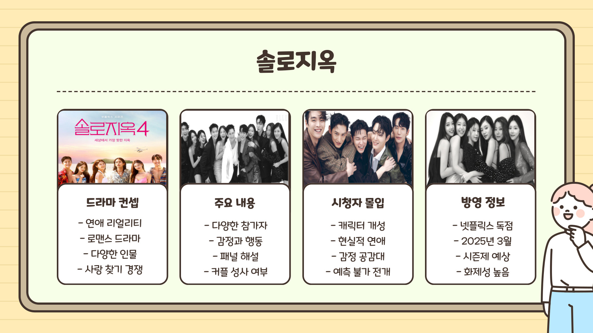 네 번째는 솔로지옥 이에요. 이 드라마는 연애 리얼리티 프로그램을 배경으로 한 로맨스 드라마로, 다양한 인물들이 서로의 사랑을 찾기 위해 경쟁하는 모습을 그려요. 특히, 각 캐릭터의 개성과 매력이 돋보여서 시청자들이 쉽게 몰입할 수 있을 것 같아요.