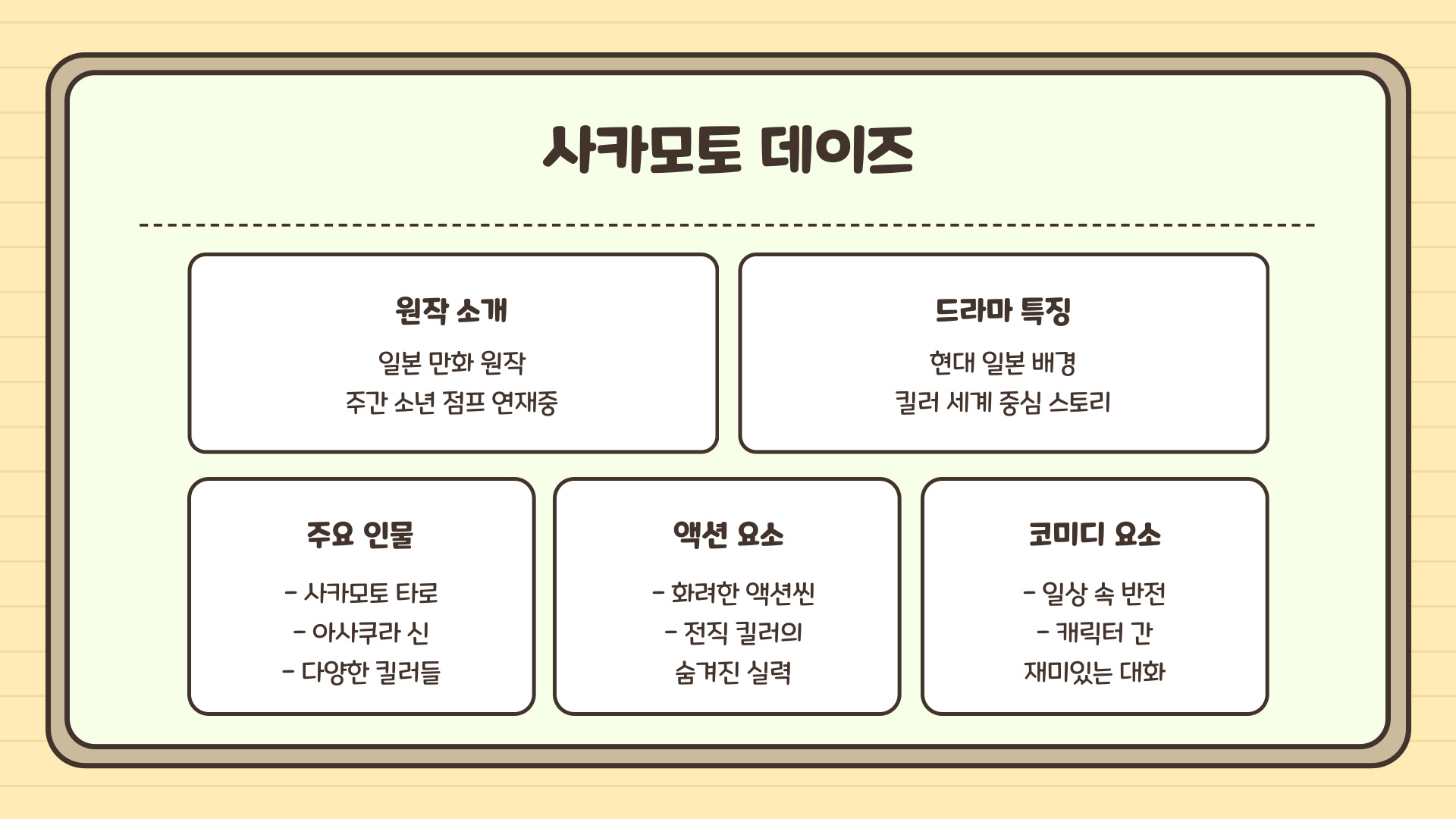 다섯 번째로 소개할 드라마는 사카모토 데이즈 에요. 이 드라마는 일본 만화를 원작으로 한 작품으로, 주인공이 평범한 일상 속에서 겪는 특별한 사건들을 그린답니다. 액션과 코미디가 적절히 섞여 있어, 다양한 연령층의 시청자들에게 사랑받을 것으로 기대돼요.