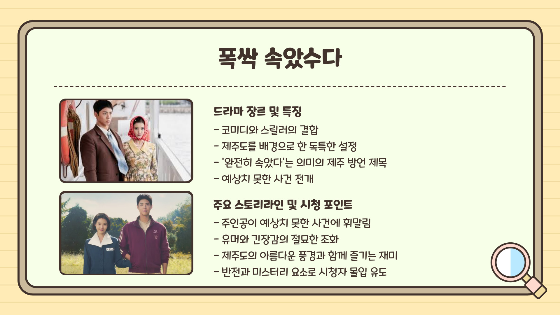 세 번째로 소개할 드라마는 폭싹 속았수다 에요. 이 드라마는 코미디와 스릴러가 결합된 장르로, 주인공이 예상치 못한 사건에 휘말리면서 벌어지는 해프닝을 그린답니다. 유머와 긴장감이 적절히 조화를 이루어 시청자들에게 큰 웃음을 줄 것으로 예상돼요.